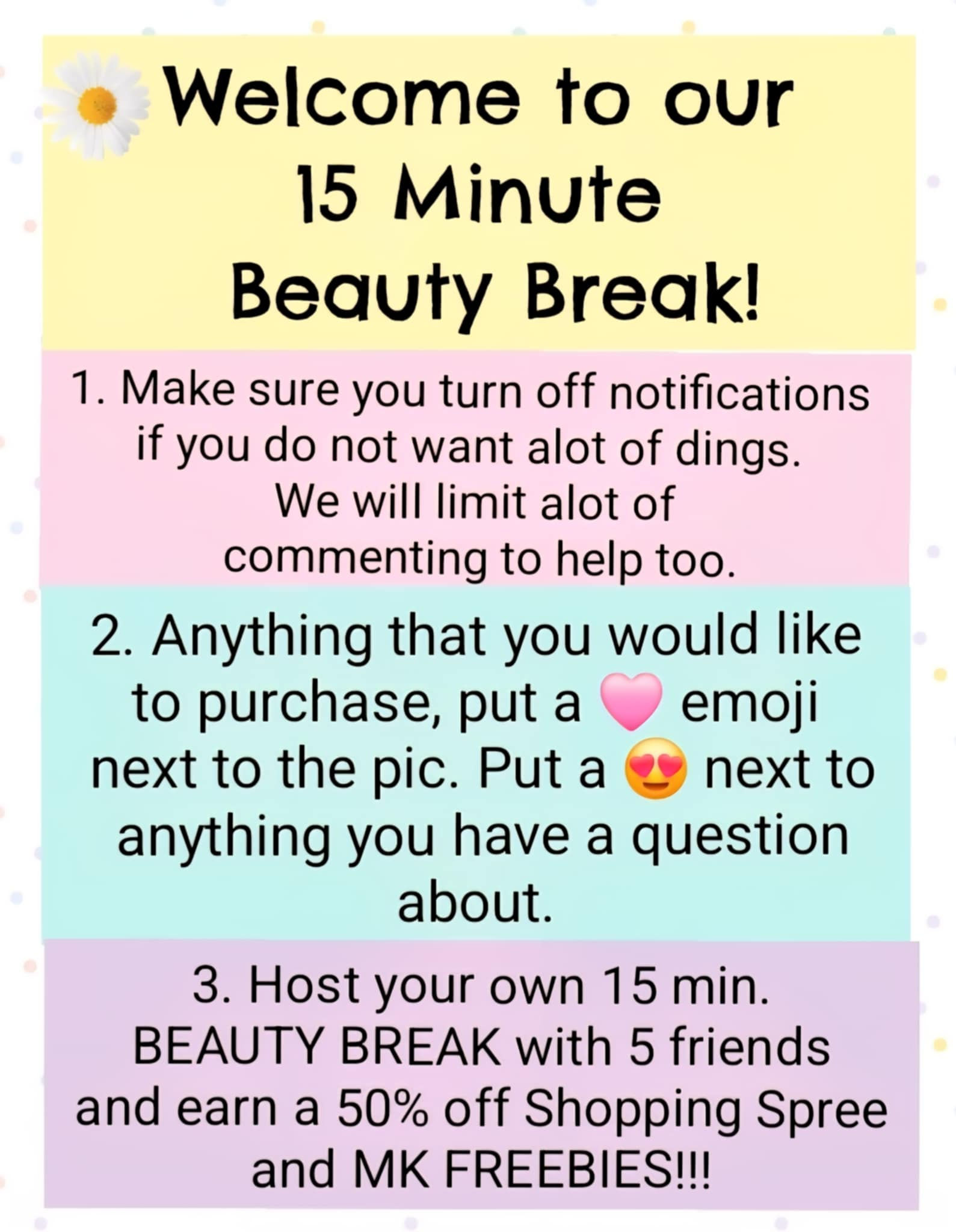 Welcome to @NAME 15 min Beauty Break! We will be here in this messenger chat tomorrow evening at 8pm est. :-)